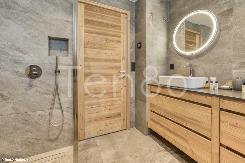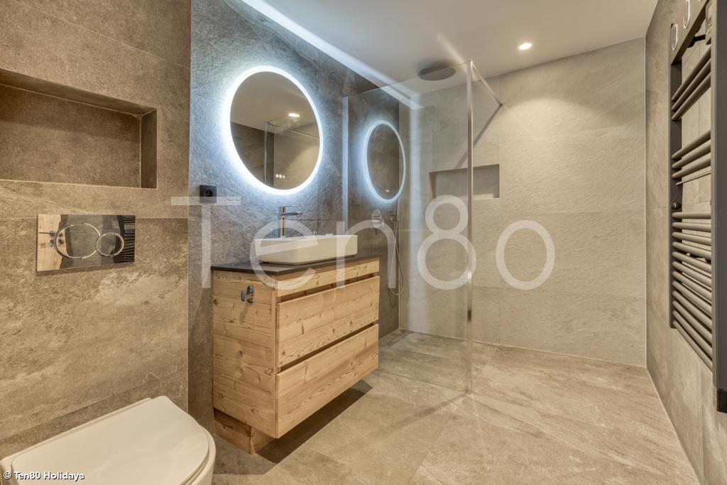 A gym and a garage equipped with ski racks, boot dryers and a laundry area with washing machine and tumble dryer complete the chalet.