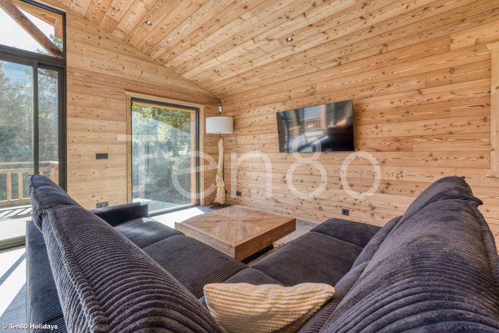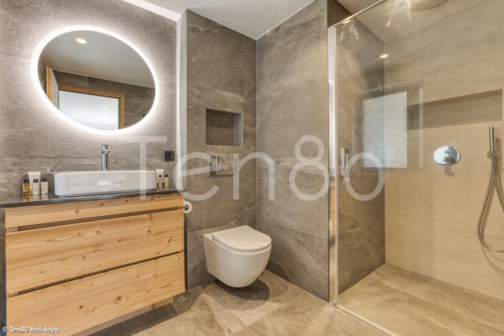 On the first floor, the main living area with open-plan fitted kitchen, dining table, fireplace and lounge has plenty of character and opens onto a beautiful terrace with breathtaking views of the Mont Blanc massif. This level also has a fourth bedroom (which can also be configured with a double bed or two single beds) with its own bathroom, opening onto a large terrace overlooking the Fiz mountain range.