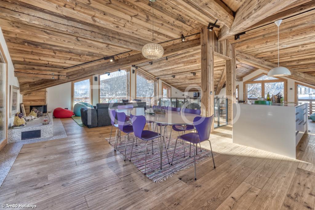 Son vaste espace de vie, très lumineux, avec cuisine équipée, salle à manger et salon avec une cheminée design, possède un charme unique et une vue imprenable.