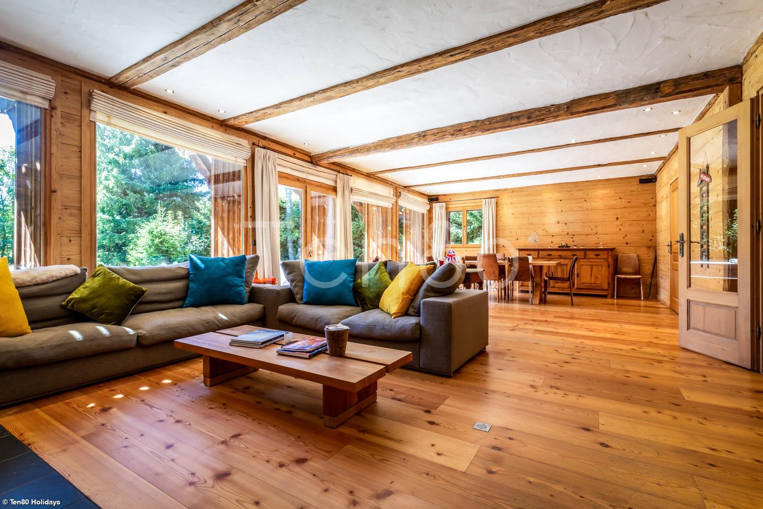 Le vaste et confortable salon avec cheminée est orienté Sud et ouvre sur une terrasse spacieuse avec vue sur le Mont Blanc.