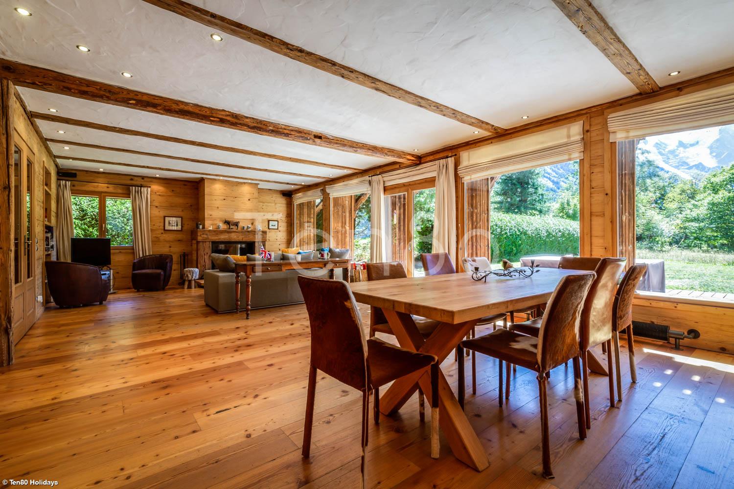Ce spacieux chalet de 4 chambres avec sauna et jacuzzi, est situé au calme dans un secteur privilégié et offre une vue unique sur Les Drus et le Mont Blanc.